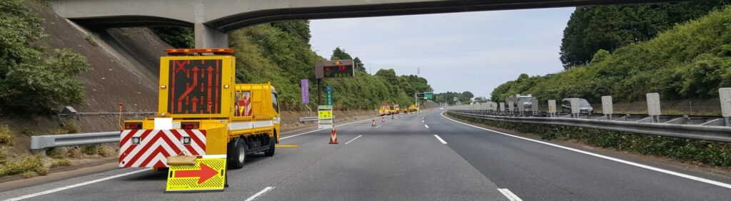 高速道路の保守点検工事に伴う規制で、NEXCO基準に準拠した安全誘導を実施します。